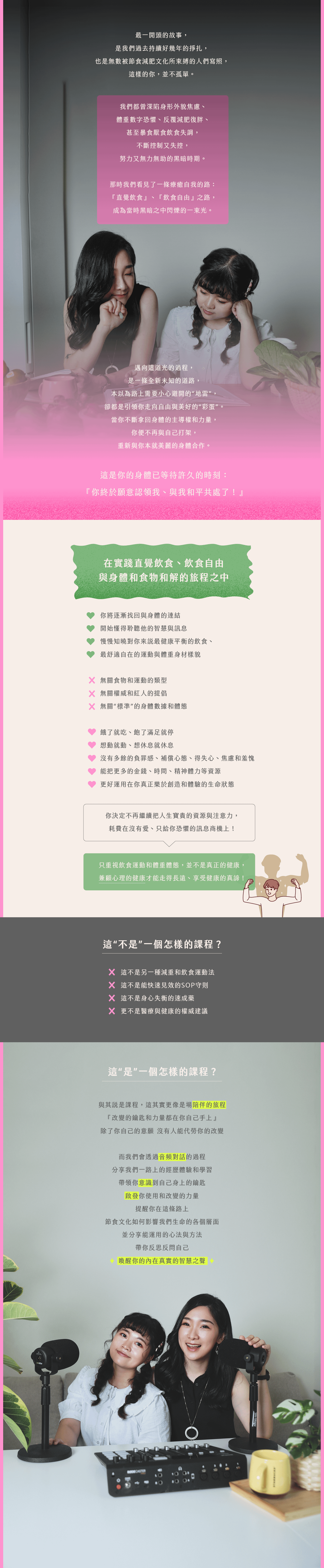 親身經歷6~7年飲食失調 在社群與Podcast上用4~5年的時間 真實分享從飲食和體態控制到飲食自由的轉變過程 訪談超過百位擁有相關知識與經驗的來賓 累積超過四百萬收聽量 啟發與影響無數深受節食文化困擾的人們