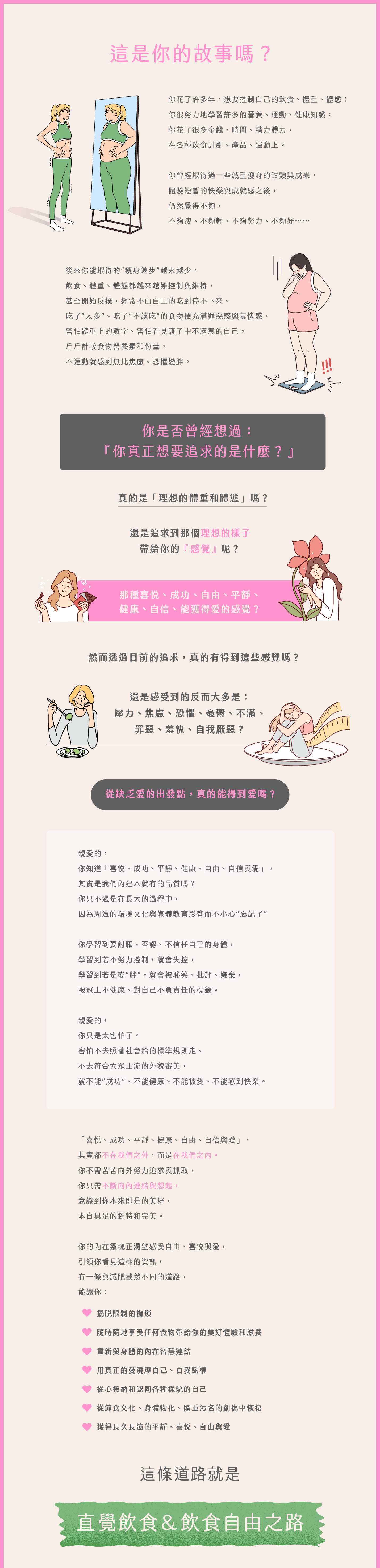 因經歷近十年飲食失調過程而認識直覺飲食法 成為台灣首為直覺飲食諮詢師,致力於 幫助有身材體態與飲食健康焦慮的人們獲得身心健康與飲食自由